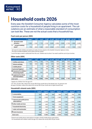 Every year, the Swedish Consumer Agency calculates some of the most common costs for a household of people living in an apartment. The calculations are an estimate of what a reasonable standard of consumption can look like. These are not the actual costs that a household has.
