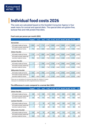 The costs are calculated based on the Swedish Consumer Agency´s four week menu for normal and special diets. The special diets are gluten-free, lactose-free and milk protein-free diets.